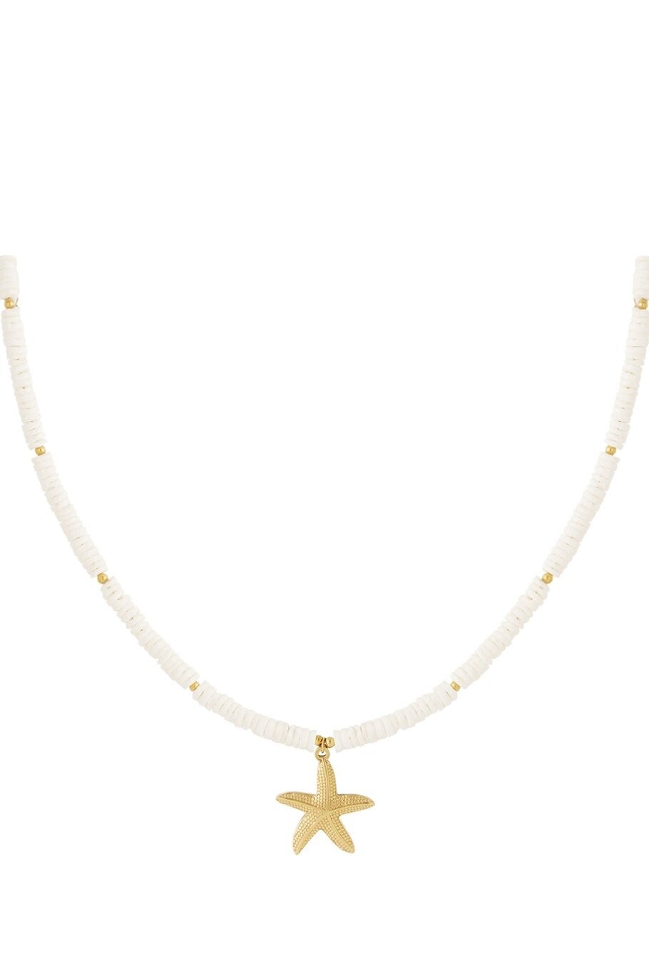 Deze ketting heeft een frisse, minimalistische en zomerse uitstraling. Hij bestaat uit witte schijfkralen, subtiel afgewisseld met kleine gouden kraaltjes, en heeft als eyecatcher een goudkleurige zeester-hanger in het midden. Het ontwerp is eenvoudig maar stijlvol, waardoor hij perfect is om zowel solo te dragen als te combineren met andere kettingen in laagjes.